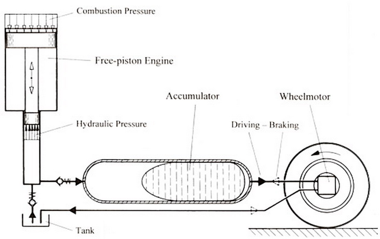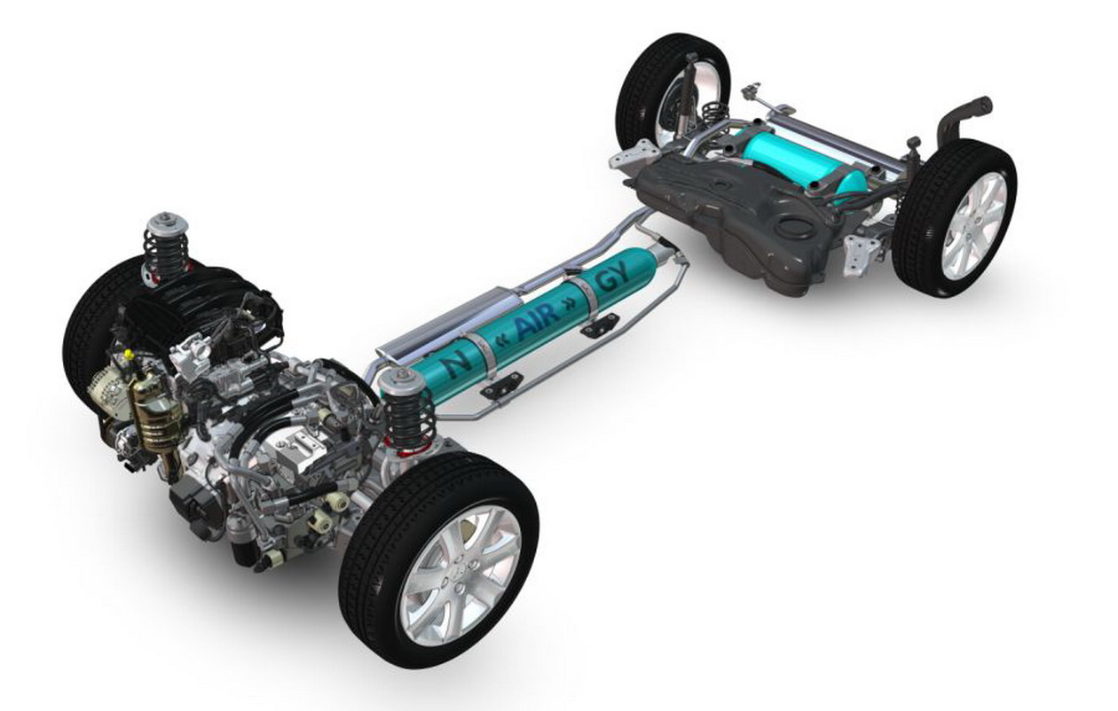- Hidravlično-pnevmatski hibrid uporablja črpalko za stiskanje in shranjevajna fluida v hranilnik, ki mora vzdržati visoke tlake. Količina shranjene energije je razmeroma mala, vendar se pretvorba iz kinetične v tlačno energijo in nasprotno dogaja zelo hitro, zato je tak sistem primeren za hitro speljevanje vozila. Hibrid na stisnjen zrak je manj preizkušena varianta hranjenja energije, pri kateri se predpostavlja, da bi imel doseg 200 kilometrov.