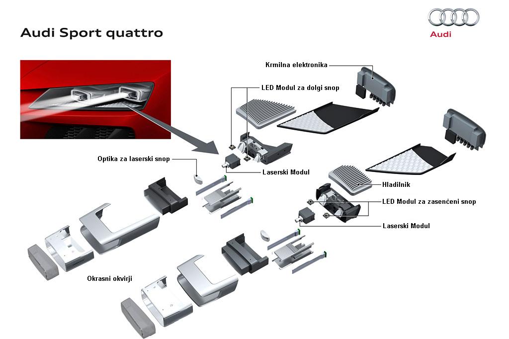 Kot prvi je že leta 2011 o njih začel na glas govoriti BMW, takrat je za leto 2014 napovedal tudi prihod prvega serijsko izdelanega laserskega žarometa, ki naj bi ga vgradili v hibridni športnik BMW i8. Leto 2014 je tu in BMW i8 loči od začetka prodaje le še nekaj mesecev, na ‘laserski’ vlak pa z velikim pompom zdaj skače še Audi, ki napoveduje, da bo kot prvi poslal na trg serijsko izdelani žaromet z lasersko tehniko, a temu glede na skorajšnji prihod i8, tudi dejstvo, da so možje iz Ingolstadta z njimi opremili že dva avta, pač ne moremo verjeti. Oba Audija sta namreč še zelo daleč od serijske proizvodnje, saj je prvi dirkalnik, Audi R18 E-tron Quattro z letnico 2014, namenjen udejstvovanju v 24-urnem vzdržljivostnem tekmovanju Le Mans, drugi pa strogo konceptni Audi Sport Quattro. A pustimo šopirjnje tržnikov s severa in juga Bavarske za nekaj trenutkov ob strani in se posvetimo samim osnovam laserskih žarometov.