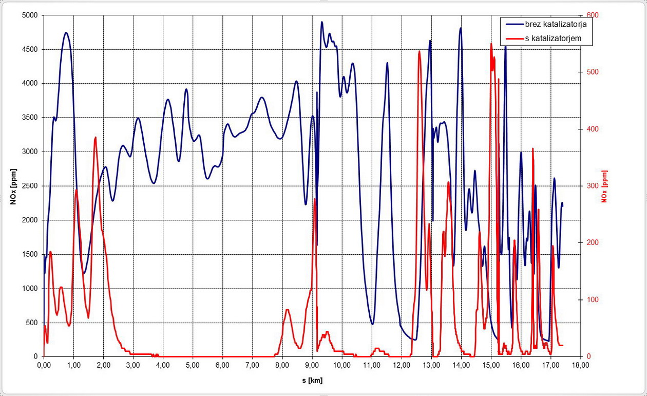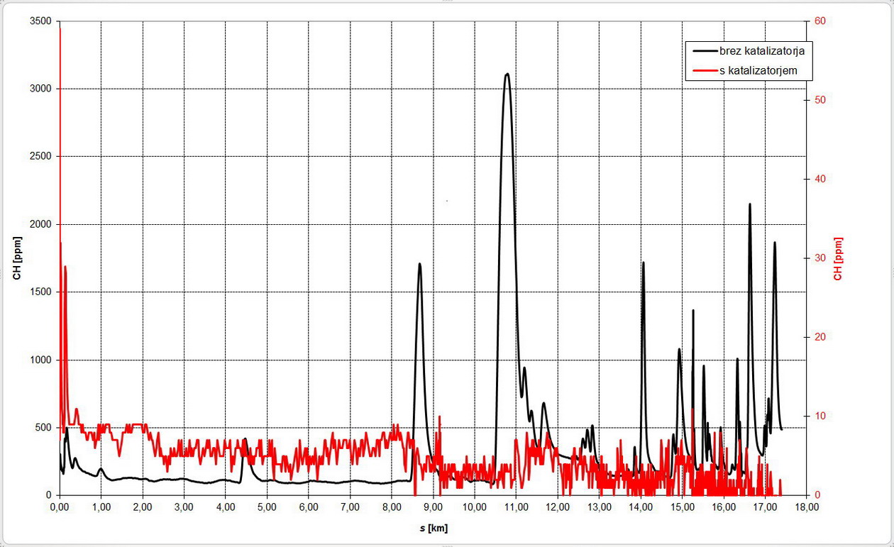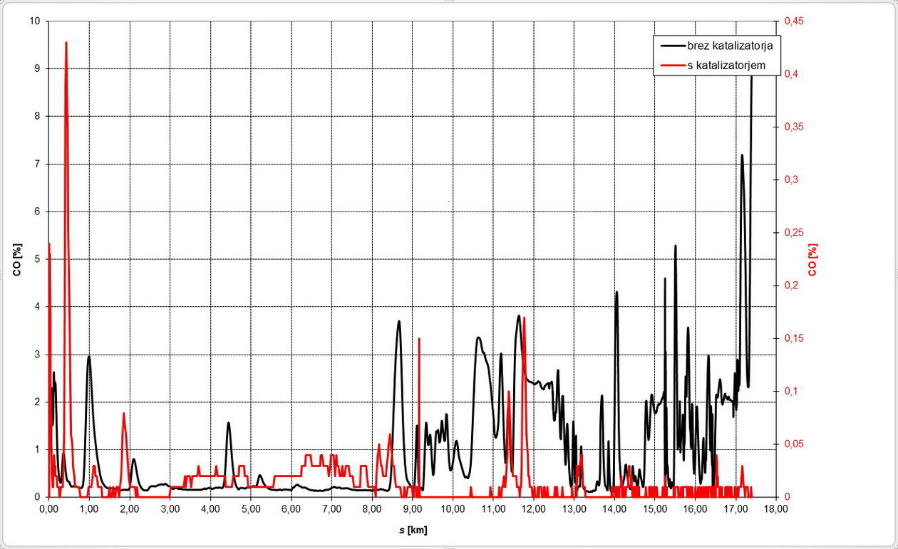 Primer dejanske pretvorbe plinov pri vožnji so prikazani v diagramih na slikah. Na slikah sta prikazani dve krivulji in sicer koncentracija plinov pri podobnih vozilih z bencinskim motorjem z in brez katalitičnega pretvornika. Ker je bila primerjava izvedena pri praktično enakih pogojih, je zato mogoča tudi neposredna primerjava med obema krivuljama. Na osnovi diagramov je mogoče ugotoviti, da so lahko katalitični pretvorniki učinkoviti vse do trenutka, ko je nastavitev razmerja zraka in goriva približno enaka stehiometričnemu razmerju, kar velja za normalno vožnjo. V kolikor pa želimo iz motorja iztisniti čim več, potem pretvornik zaradi presežka goriva ni več učinkovit, zato ne moremo več računati na kisik, ki sodeluje pri oksidaciji CO in CH. V tem primeru se samo močno poveča količina redukcijskih elementov CO in CH, kar omogoča delno znižati NOx, v celoti pa močno pade učinkovitost pretvorbe v katalizatorju.
