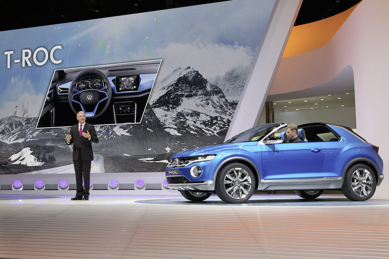Nemški Volkswagen (VW) je že na predvečer prvega novinarskega dneva na salonu pokazal študijo majhnega športnega terenca (SUV) z oznako oziroma imenom T-ROC. Narejen na novi modularni osnovi (MQB) in Golfovih dimenzij (v dolžino se potegne do 418 centimetrov) očitno potrjuje ambicijo nemške avtomobilske hiše, da se po Tiguanu in Touaregu pojavi še v nižjem razredu tovrstnih avtomobilov.